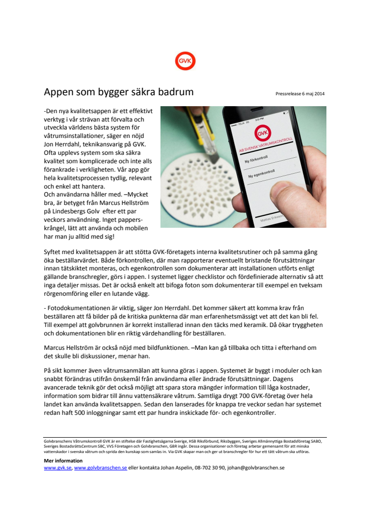 På sikt kommer även våtrumsanmälan att kunna göras i appen. Systemet är byggt i moduler och kan snabbt förändras utifrån önskemål från användarna eller ändrade förutsättningar. Dagens avancerade teknik gör det också möjligt att spara stora mängder information till låga kostnader, information som bidrar till ännu vattensäkrare våtrum. Samtliga drygt 700 GVK-företag över hela landet kan använda kvalitetsappen. Sedan den lanserades för knappa tre veckor sedan har systemet redan haft över 500 inloggningar samt ett par hundra inskickade för- och egenkontroller.