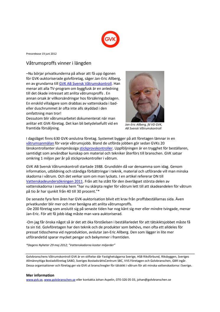 –Nu börjar privatkunderna på allvar att få upp ögonen för GVK-auktoriserade golvföretag, säger Jan-Eric Allberg, en av grundarna till GVK AB Svensk Våtrumskontroll. Han menar att alla TV-program om byggfusk är en anledning till det ökade intresset att anlita våtrumsproffs. En annan orsak är villkorsändringar hos försäkringsbolagen. En enskild villaägare som drabbas av vattenskada i bad- eller duschrummet är ofta inte alls skyddad i den omfattning man tror! Dessutom blir våtrumsarbetet dokumenterat när man anlitar ett GVK-företag. Det kan bli betydelsefullt vid en framtida försäljning.