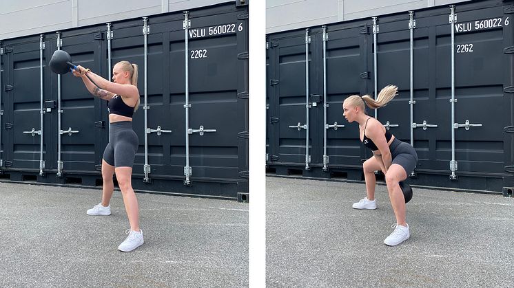 Ställ dig axelbrett eller bredare och håll kettlebellen med båda händerna. Böj benen och håll bålen så att du varken svankar eller böjer på ryggen. Räta sedan på benen och spänn rumpan och repetera övningen.