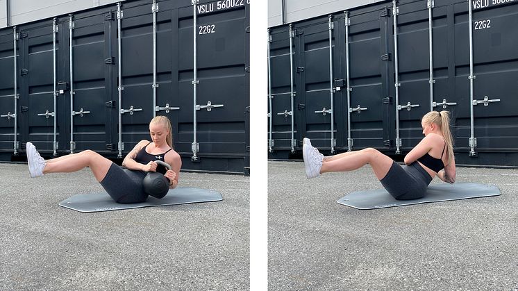 Börja med att lyfta upp benen över marken och hitta balans. Håll din kettlebell med båda händerna och vrid din överkropp diagonalt åt ena hållet och sedan åt andra i en långsam och kontrollerad rörelse. Om övningen är för avancerad så sätt ner fötterna på marken och utför samma rörelse.