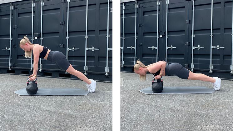 Ställ ned dina kettlebells på marken i axelbredd och ta tag i handtagen. Ställ dig i en planka och sänk dig ner så långt du kan. Försök att hålla in armbågarna nära kroppen. Aktivera magmuskulaturen och håll den genom hela övningen. För dig sedan uppåt och se till att inte rumpan åker upp.