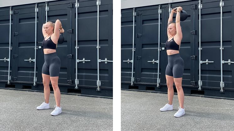 Stå raklång och spänn bålen så att du inte svankar. Håll din kettlebell med båda händerna bakom huvudet. Lyft upp din kettlebell så att armarna blir raka och upprepa sedan övningen.