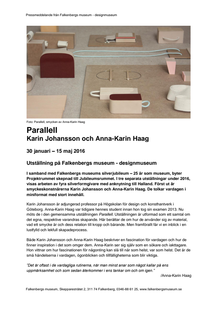 I samband med Falkenbergs museums silverjubileum – 25 år som museum, byter Projektrummet skepnad till Jubileumsrummet. I tre separata utställningar under 2016, visas arbeten av fyra silverformgivare med anknytning till Halland. Först ut är smyckeskonstnärerna Karin Johansson och Anna-Karin Haag. De tolkar vardagen i miniformat med stort innehåll.
