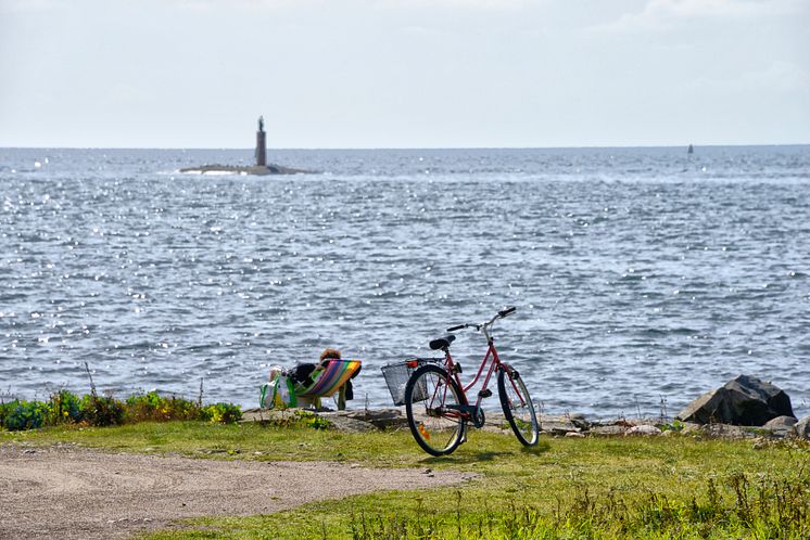 Cykla på Kattegattleden, den kustnära cykelleden. Bilden tagen vid Strandpromenaden, Varberg. För användning i kommersiellt syfte, kontakta info@halland.se.