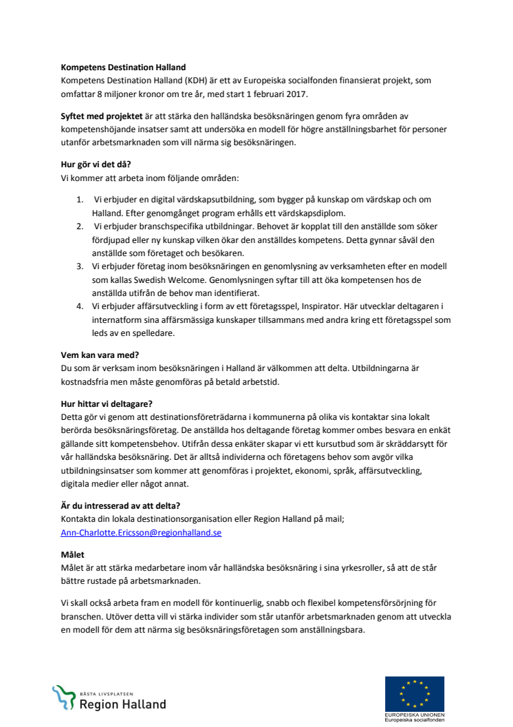 Projektet kommer under tre års tid finansieras med nära åtta miljoner kronor som ska gå till kompetenshöjande insatser inom fyra olika områden riktat till företag inom den halländska besöksnäringen. De fyra olika områdena är kunskap om digitalt värdskap, affärsutveckling, branschspecifika utbildningar utifrån branschens egenidentifierade behov och verksamhetsgenomlysning för boendeanläggningar. Syftet är att höja kompetensen hos de anställda i näringen samtidigt som det är ett strategiskt arbete med fokus på att hitta långsiktiga lösningar för snabb, flexibel och kontinuerlig kompetensutveckling.