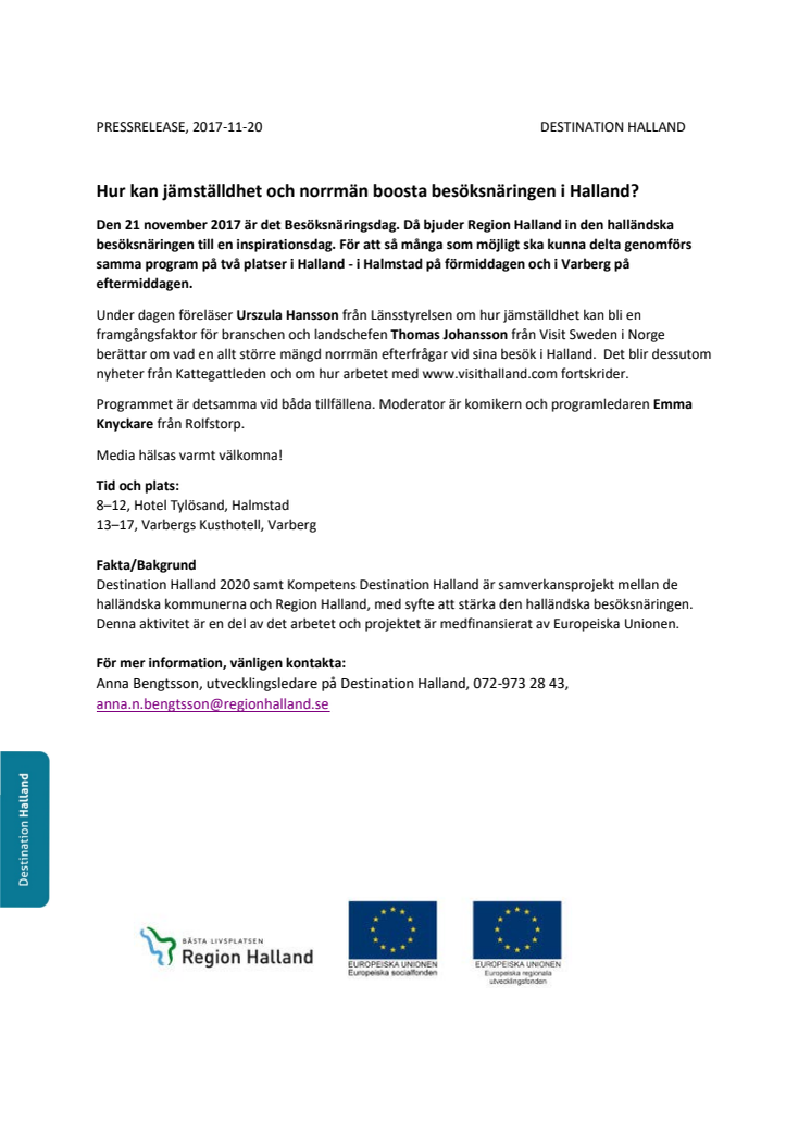 Anna Bengtsson, utvecklingsledare på Destination Halland, 072-973 28 43, anna.n.bengtsson@regionhalland.se