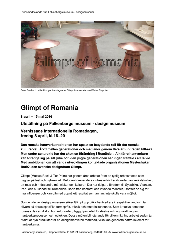 Designduon Glimpt, Tor Palm & Mattias Rask, samarbetar med hantverkare från hela världen. Syftet är att skapa förutsättningar till självförsörjande och bevarande av lokalt hantverk. De blev 2014 kontaktade av Mesteshukar ButiQ, en organisation som arbetar för att bevara och berätta om romsk historia och kultur. De undrade om Glimpt ville samarbeta med romska hantverkare i Rumänien. Utställningen visar både de romska hantverkarnas arbete och produkter framtagna i samarbete med Glimpt. I samarr. med Rumänska kulturinstitutet.