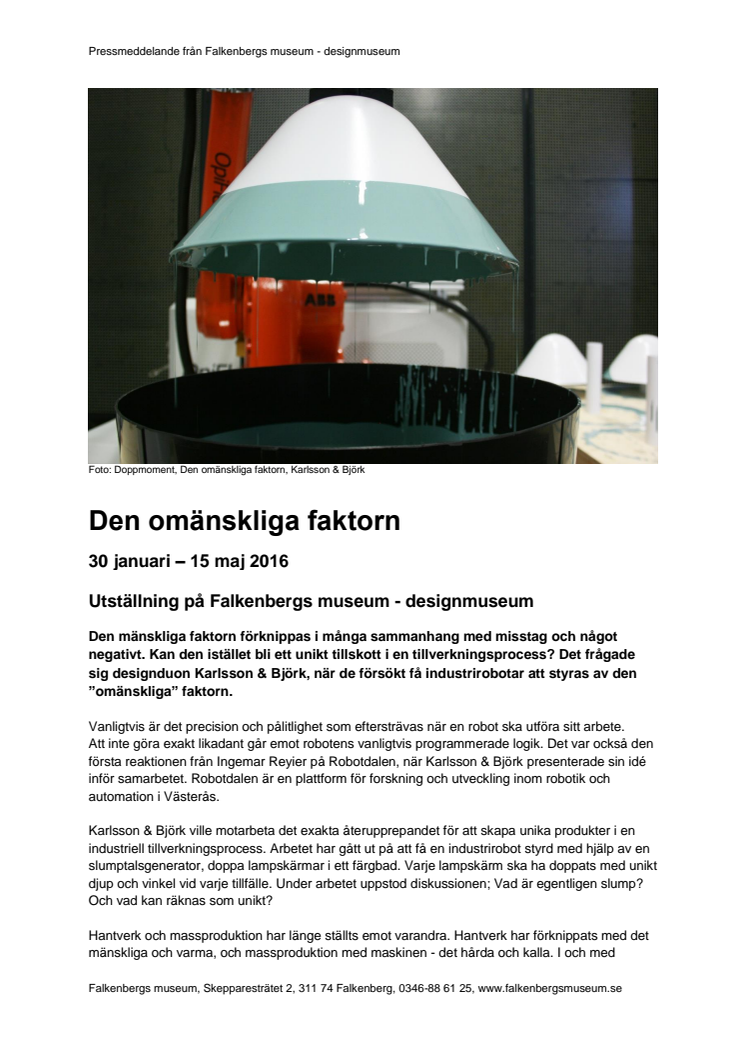 En av tre utställningar, på Falkenbergs museum under våren, är Den omänskliga faktorn. Den handlar om att få en industrirobot att styras av slump och tillverka unika produkter. Kommer robotar i framtiden att ta över kreativt skapande? Troligen inte, sett till utställningarna Glimpt of Romania och Ur Björk. De vittnar båda om hantverket som viktig del av vårt kulturarv samt möjlig källa till inkomst. I Jubileumsrummet uppmärksammas att museet i år fyller 25 år. Här visas under året smycken och föremål av formgivare med halländsk anknytning. Allt med temat silver.