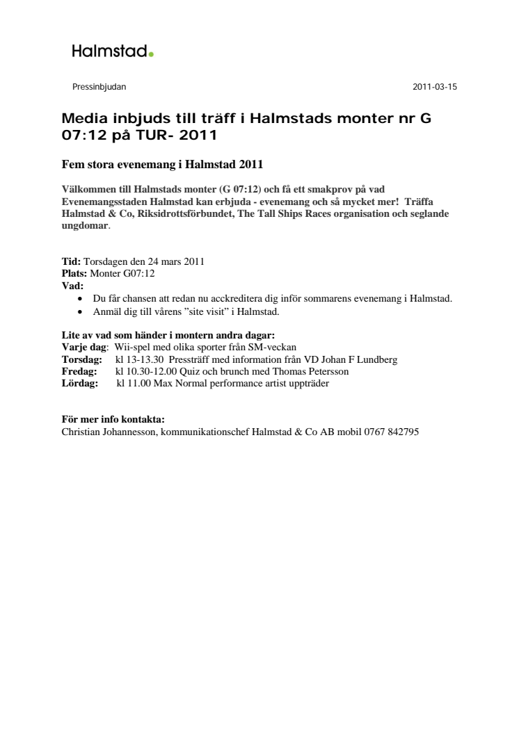 Media inbjuds till träff i Halmstads monter nr G 07:12 på TUR- 2011