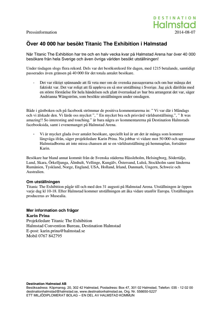 När Titanic The Exhibition har tre och en halv vecka kvar på Halmstad Arena har över 40 000 besökare från hela Sverige och även övriga världen besökt utställningen!