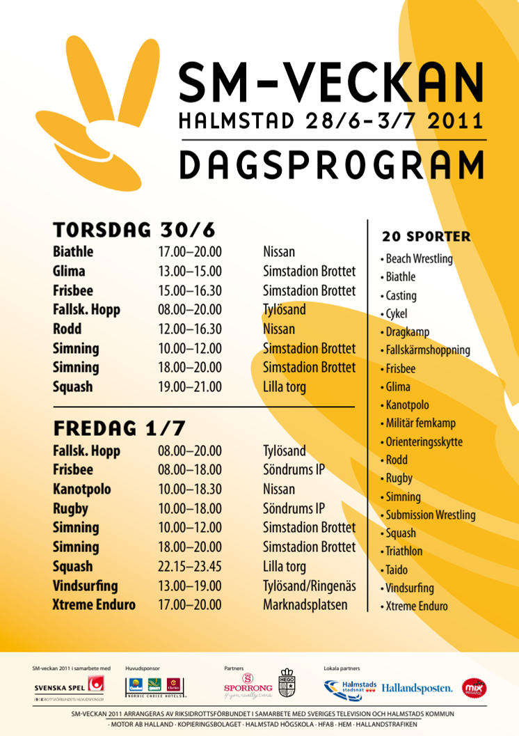 Under SM-veckan händer lite varje dag här är ett axplock. Ett fel upptäcktes i tävlingsprogrammet för torsdagen den 30 juni. Under torsdagen kommer Frisbee DDC spelas på Söndrums IP klockan 09:00-12:00. Finalen kommer att spelas på Brottet. Discgolfen avgjordes under måndagen.