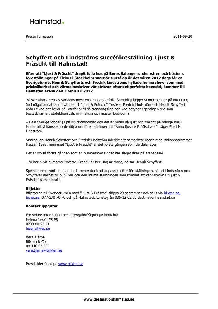 Efter att ”Ljust & Fräscht” dragit fulla hus på Berns Salonger under våren är dags för en Sverigeturné. Henrik Schyfferts och Fredrik Lindströms hyllade humorshow, som med pricksäkerhet och värme beskriver vår strävan efter det perfekta boendet, kommer till Halmstad Arena den 3 februari 2012.