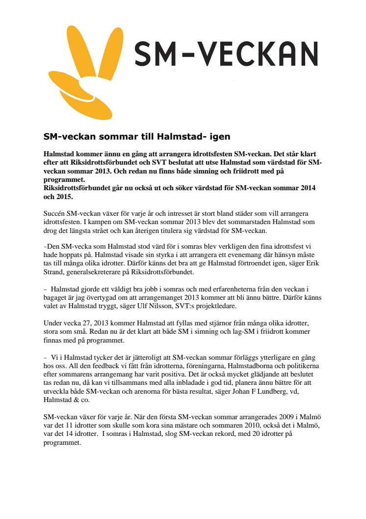 Halmstad kommer ännu en gång att arrangera idrottsfesten SM-veckan. Det står klart efter att Riksidrottsförbundet och SVT beslutat att utse Halmstad som värdstad för SM-veckan sommar 2013. Och redan nu finns både simning och friidrott med på programmet.