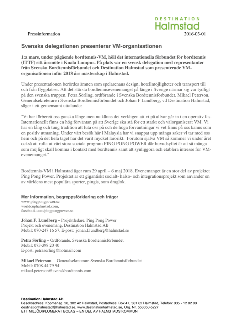 1:a mars, under pågående bordtennis-VM, höll det internationella förbundet för bordtennis (ITTF) sitt årsmöte i Kuala Lumpur. På plats var en svensk delegation med representanter från Svenska Bordtennisförbundet och Destination Halmstad som presenterade VM-organisationen inför 2018 års mästerskap i Halmstad.