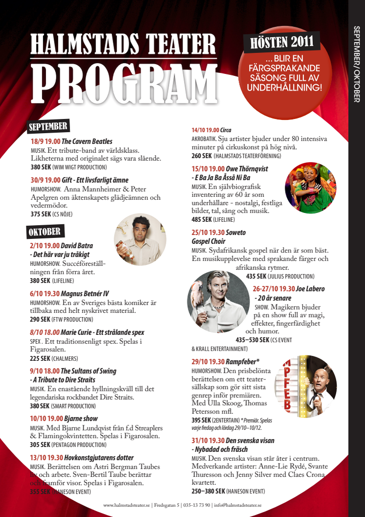 Inför nypremiären av Halmstads teater släpptes idag programmet för hösten 2011. Höjdpunkter som Sverigepremiären av Rampfeber med Thomas Petersons och Ulla Skoog, Svansjön och artister som David Batra och Joe Labero.