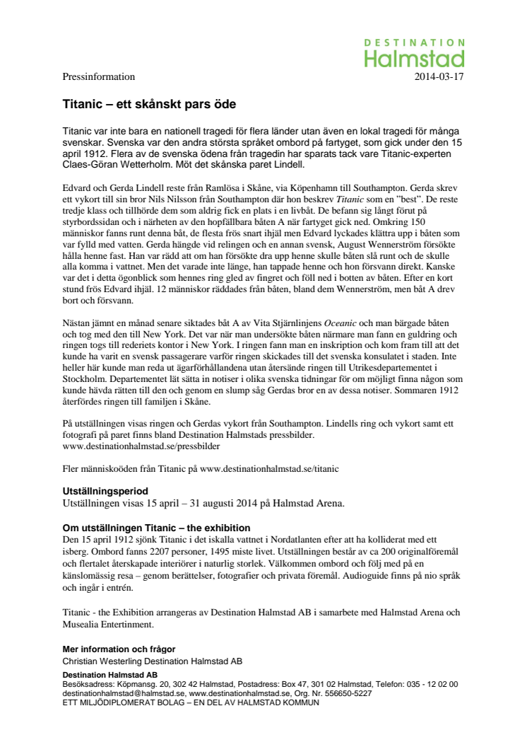 Titanic var inte bara en nationell tragedi för flera länder utan även en lokal tragedi för många svenskar. Svenska var den andra största språket ombord på fartyget, som gick under den 15 april 1912. Flera av de svenska ödena från tragedin har sparats tack vare Titanic-experten Claes-Göran Wetterholm. Möt det skånska paret Lindell.