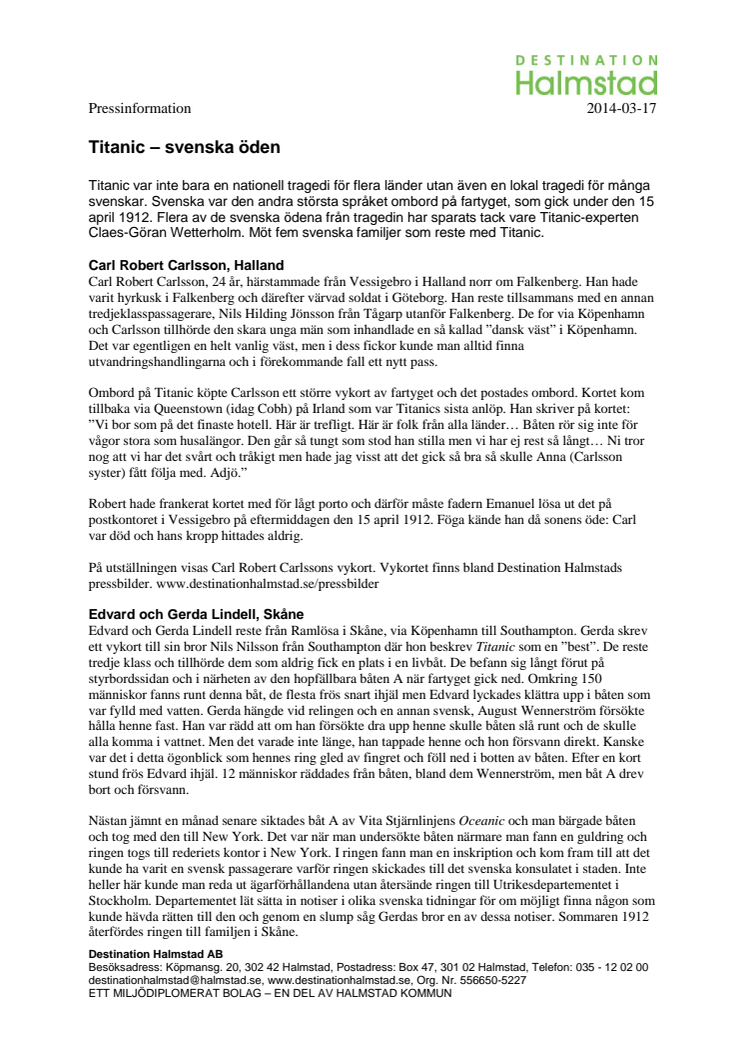 Titanic var inte bara en nationell tragedi för flera länder utan även en lokal tragedi för många svenskar. Svenska var den andra största språket ombord på fartyget, som gick under den 15 april 1912. Flera av de svenska ödena från tragedin har sparats tack vare Titanic-experten Claes-Göran Wetterholm. Möt fem svenska familjer som reste med Titanic.