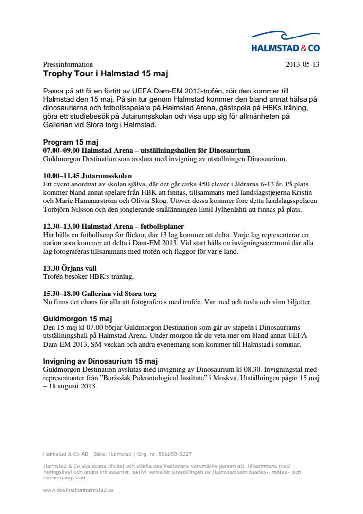 Passa på att få en förtitt av UEFA Dam-EM 2013-trofén, när den kommer till Halmstad den 15 maj. På sin tur genom Halmstad kommer den bland annat hälsa på dinosaurierna och fotbollsspelare på Halmstad Arena, gästspela på HBKs träning, göra ett studiebesök på Jutarumsskolan och visa upp sig för allmänheten på Gallerian vid Stora torg i Halmstad.