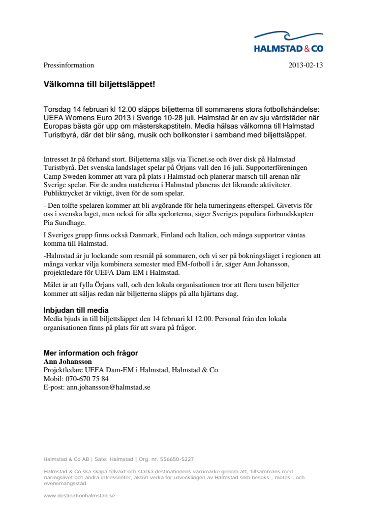 Torsdag 14 februari kl 12.00 släpps biljetterna till sommarens stora fotbollshändelse: UEFA Womens Euro i Sverige 10-28 juli. Halmstad är en av sju värdstäder när Europas bästa gör upp om mästerskapstiteln. Media hälsas välkomna till Halmstad Turistbyrå, där det blir sång, musik och bollkonster i samband med biljettsläppet.