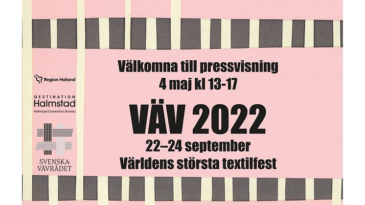 VÄV2022 är världens största mötesplats och textilfest. Tusentals väv- och textilintresserade från hela världen gästar Halmstad och Halland i september. Varje gång evenemanget genomförs skapar det AHA-känslor hos besökare, invånare, hela samhället och näringslivet – tänk att det är så stort! Många blir lite tagna på sängen. Därför vill vi bjuda in till en pressträff 4 maj på Halmstad Arena.