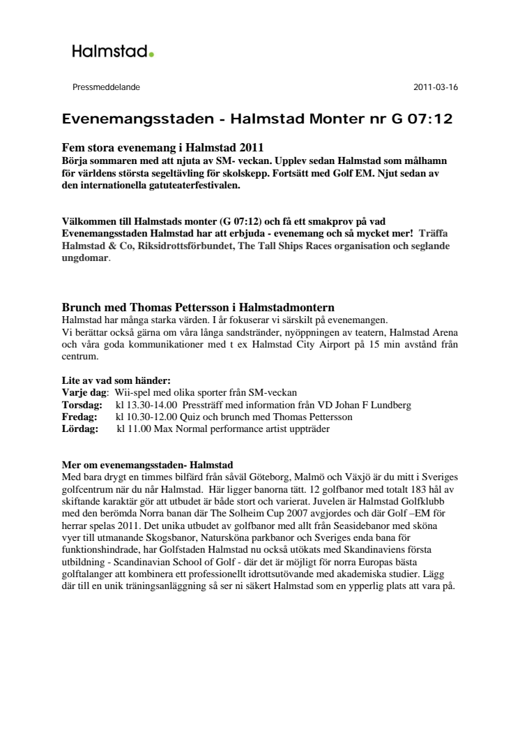Välkommen till Halmstads monter (G 07:12) på TUR 2011 i Göteborg och få ett smakprov på vad Evenemangsstaden Halmstad har att erbjuda- evenemang och så mycket mer! Träffa Halmstad & Co, Riksidrottsförbundet, The Tall Ships Races organisation och seglande ungdomar.