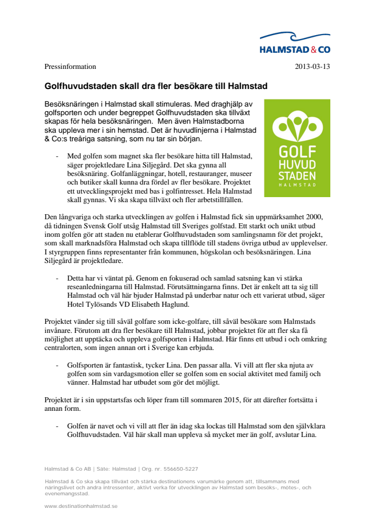 - Med golfen som magnet ska fler besökare hitta till Halmstad, säger projektledare Lina Siljegård. Det ska gynna all besöksnäring. Golfanläggningar, hotell, restauranger, museer och butiker skall kunna dra fördel av fler besökare. Projektet ett utvecklingsprojekt med bas i golfintresset. Hela Halmstad skall gynnas. Vi ska skapa tillväxt och fler arbetstillfällen.