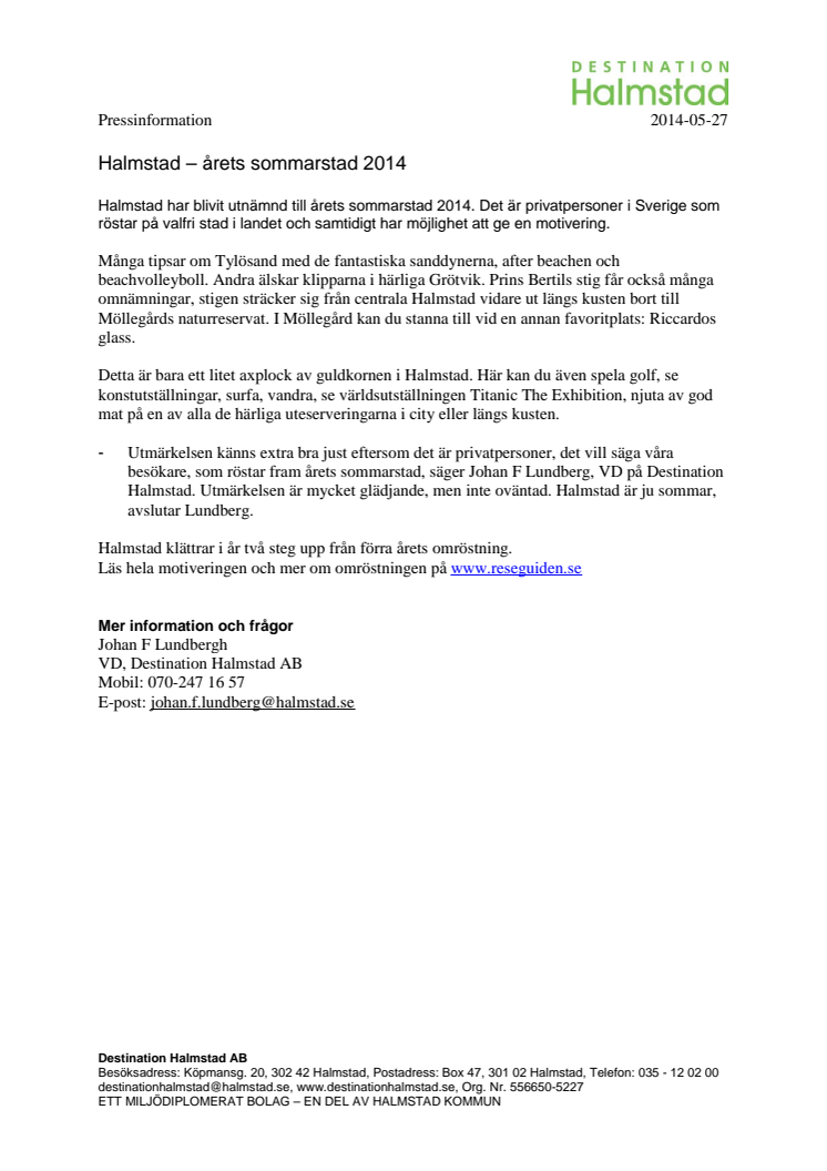 - Utmärkelsen känns extra bra just eftersom det är privatpersoner, det vill säga våra besökare, som röstar fram årets sommarstad, säger Johan F Lundberg, VD på Destination Halmstad. Utmärkelsen är mycket glädjande, men inte oväntad. Halmstad är ju sommar, avslutar Lundberg.
