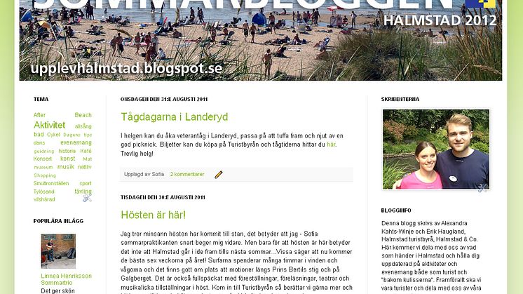 Sedan några år har Halmstad Turistbyrå tipsat om olika aktiviteter och evenemang genom en sommarblogg. Nu är det dags att starta upp igen. I år är det två bloggare som hjälps åt; Alexandra Kaths-Winje och Erik Haugland, båda anställda som sommarvikarier på turistbyrån. Följ bloggen, få inspiration och upptäck något nytt!