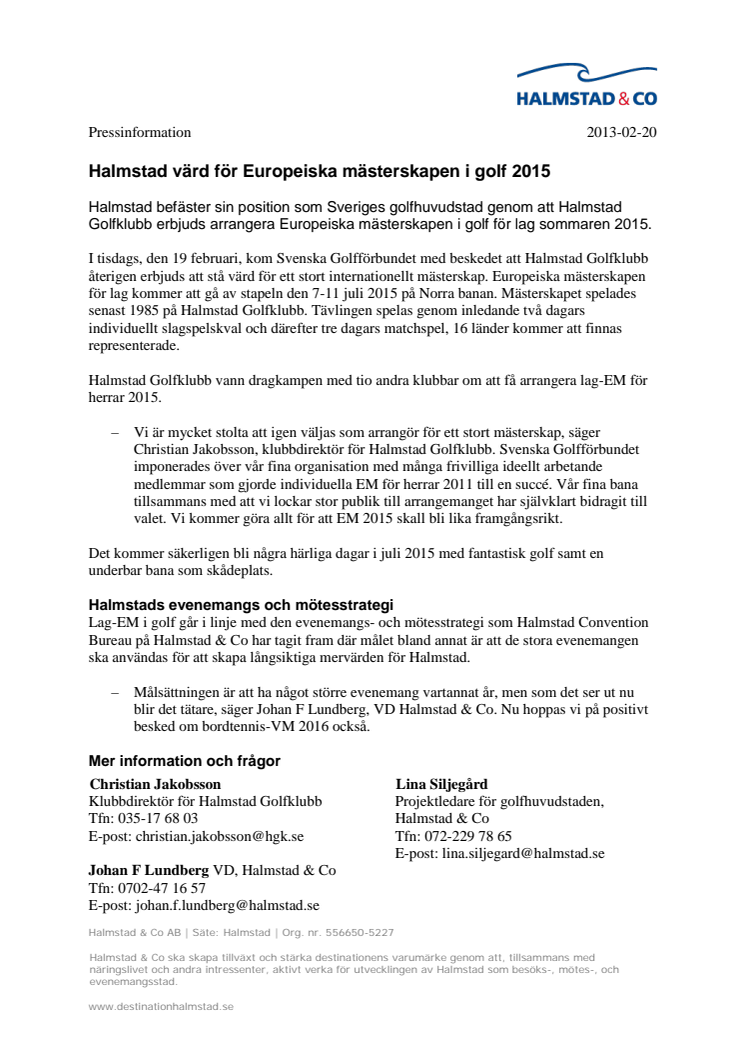 – Vi är mycket stolta att igen väljas som arrangör för ett stort mästerskap, säger Christian Jakobsson, klubbdirektör för Halmstad Golfklubb. Svenska Golfförbundet imponerades över vår fina organisation med många frivilliga ideellt arbetande medlemmar som gjorde individuella EM för herrar 2011 till en succé. Vår fina bana tillsammans med att vi lockar stor publik till arrangemanget har självklart bidragit till valet. Vi kommer göra allt för att EM 2015 skall bli lika framgångsrikt.