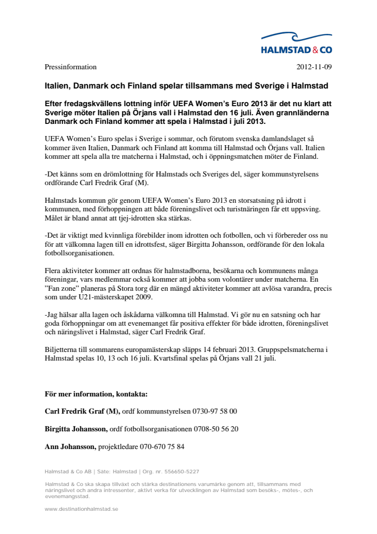 Efter fredagskvällens lottning inför UEFA Women’s Euro 2013 är det nu klart att Sverige möter Italien på Örjans vall i Halmstad den 16 juli. Även grannländerna Danmark och Finland kommer att spela i Halmstad i juli 2013.