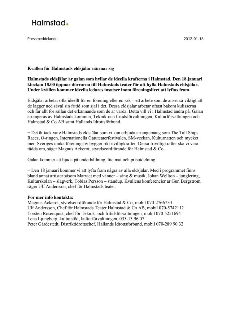 Galan kommer att bjuda på underhållning, lite mat och prisutdelning. − Den 18 januari kommer vi att lyfta fram några av alla eldsjälar. Med i programmet finns bland annat artister såsom Maryjet med vänner – sång & musik, Johan Wellton – jonglering, Kulturskolan – slagverk, Tobias Persson – standup. Kvällens konferencier är Gun Bergström, säger Ulf Andersson, chef för Halmstads teater.