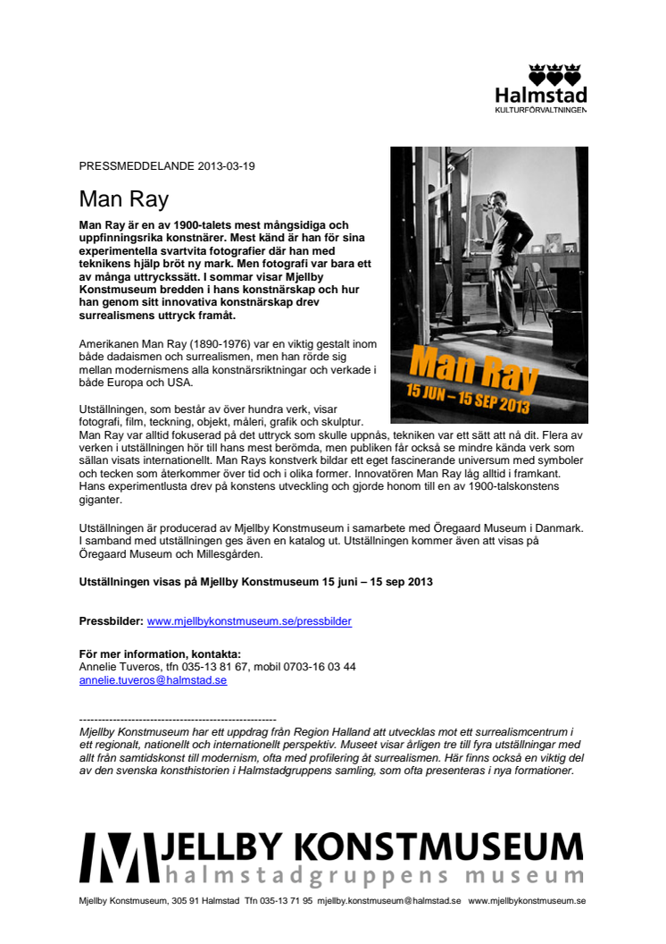 Man Ray är en av 1900-talets mest mångsidiga och uppfinningsrika konstnärer. Mest känd är han för sina experimentella svartvita fotografier där han med teknikens hjälp bröt ny mark. Men fotografi var bara ett av många uttryckssätt. I sommar visar Mjellby Konstmuseum bredden i hans konstnärskap och hur han genom sitt innovativa konstnärskap drev surrealismens uttryck framåt.