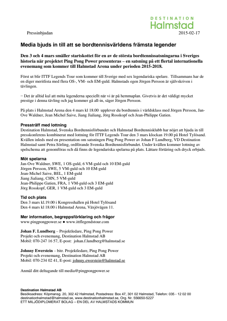 Destination Halmstad, Svenska Bordtennisförbundet och Halmstad Bordtennisklubb har nöjet att bjuda in till presskonferens kombinerat med lottning för ITTF Legends Tour den 3 mars klockan 19.00 på Hotel Tylösand. Kvällen inleds med en presentation om satsningen Ping Pong Power av Johan F Lundberg, VD Destination Halmstad samt Petra Sörling, ordförande Svenska Bordtennisförbundet. Under kvällen kommer lottning av spelschema att genomföras och då finns de legendariska spelarna på plats. Lättare förtäring och dryck erbjuds.