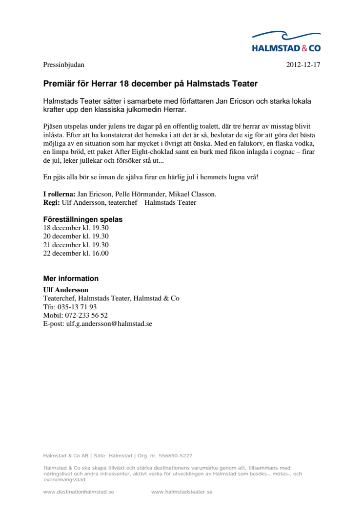 Premiär för Herrar 18 december på Halmstads Teater