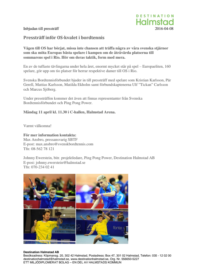 Svenska Bordtennisförbundet bjuder in till pressträff med spelare som Kristian Karlsson, Pär Gerell, Mattias Karlsson, Matilda Ekholm samt förbundskaptenerna Ulf ”Tickan” Carlsson och Marcus Sjöberg.