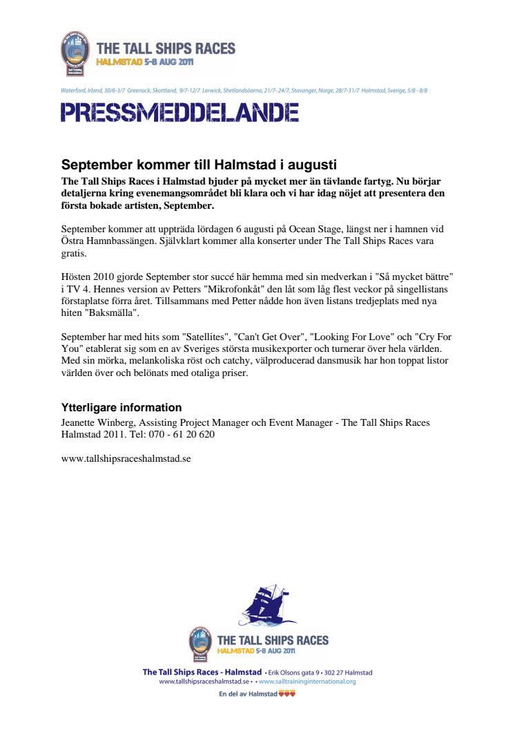 The Tall Ships Races i Halmstad bjuder på mycket mer än tävlande fartyg. Nu börjar detaljerna kring evenemangsområdet bli klara och vi har idag nöjet att presentera den första bokade artisten, September.