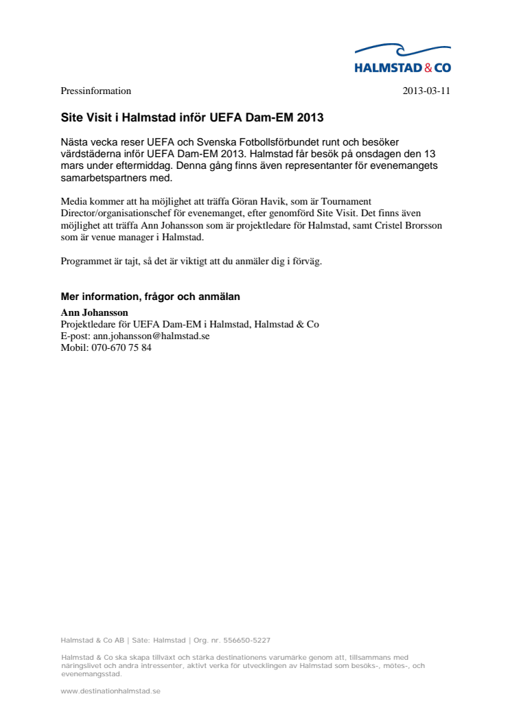 Nästa vecka reser UEFA och Svenska Fotbollsförbundet runt och besöker värdstäderna inför UEFA Dam-EM 2013. Halmstad får besök på onsdagen den 13 mars under eftermiddag. Denna gång finns även representanter för evenemangets samarbetspartners med.