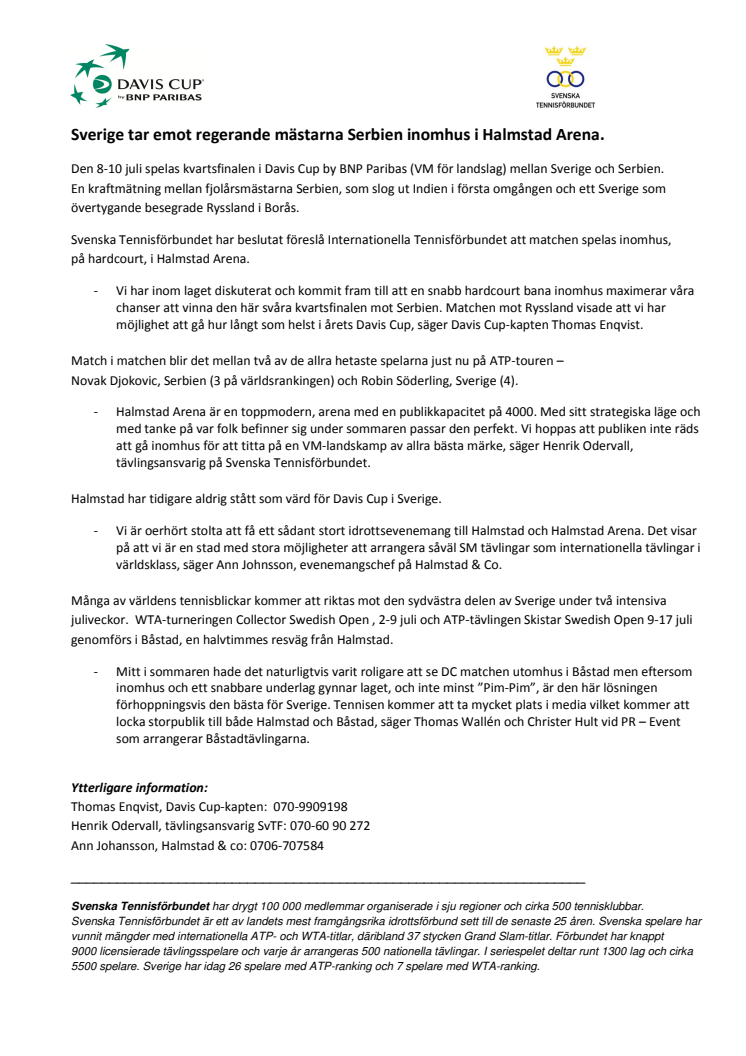 - Vi har inom laget diskuterat och kommit fram till att en snabb hardcourt bana inomhus maximerar vårachanser att vinna den här svåra kvartsfinalen mot Serbien. Matchen mot Ryssland visade att vi harmöjlighet att gå hur långt som helst i årets Davis Cup, säger Davis Cup-kapten Thomas Enqvist.