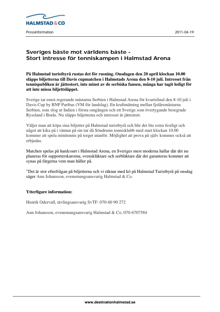 Sverige tar emot regerande mästarna Serbien i Halmstad Arena för kvartsfinal den 8-10 juli i Davis Cup by BNP Paribas (VM för landslag). En kraftmätning mellan fjolårsmästarna Serbien, som slog ut Indien i första omgången och ett Sverige som övertygande besegrade Ryssland i Borås. Nu släpps biljetterna och intresset är jättestort.