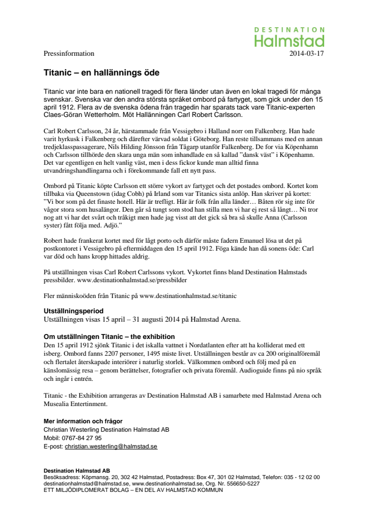 Titanic - the Exhibition arrangeras av Destination Halmstad AB i samarbete med Halmstad Arena ochMusealia Entertinment.
