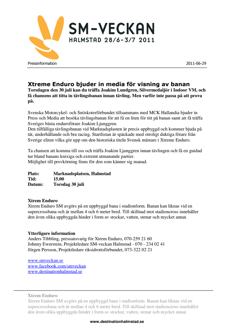 Svenska Motorcykel- och Snöskoterförbundet tillsammans med MCK Hallandia bjuder in Press och Media att besöka tävlingsbanan för att få en liten för titt på banan samt att få träffa Sveriges bästa enduroförare Joakim Ljunggren.