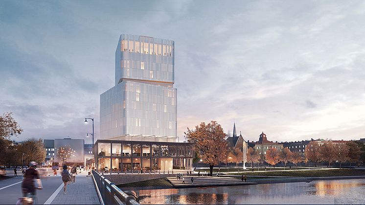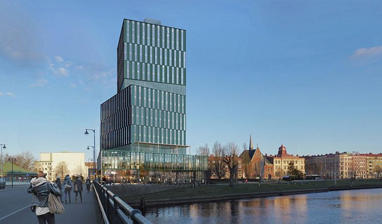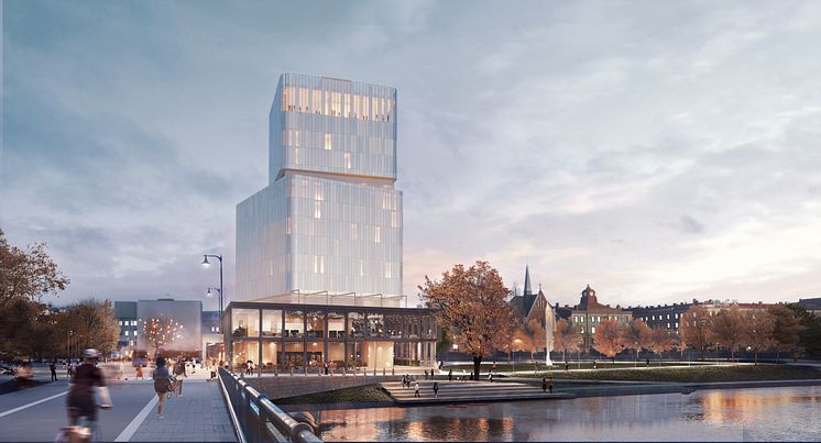 - Fasadmaterialet på de övre delarna är i glas för att byggnaden ska upplevas som lättare och för att reflektera omgivningen.