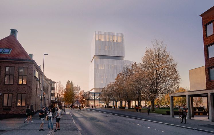 - Fasadmaterialet på de lägre delarna av byggnaden är i trä och mer anpassat till kringliggande miljö.