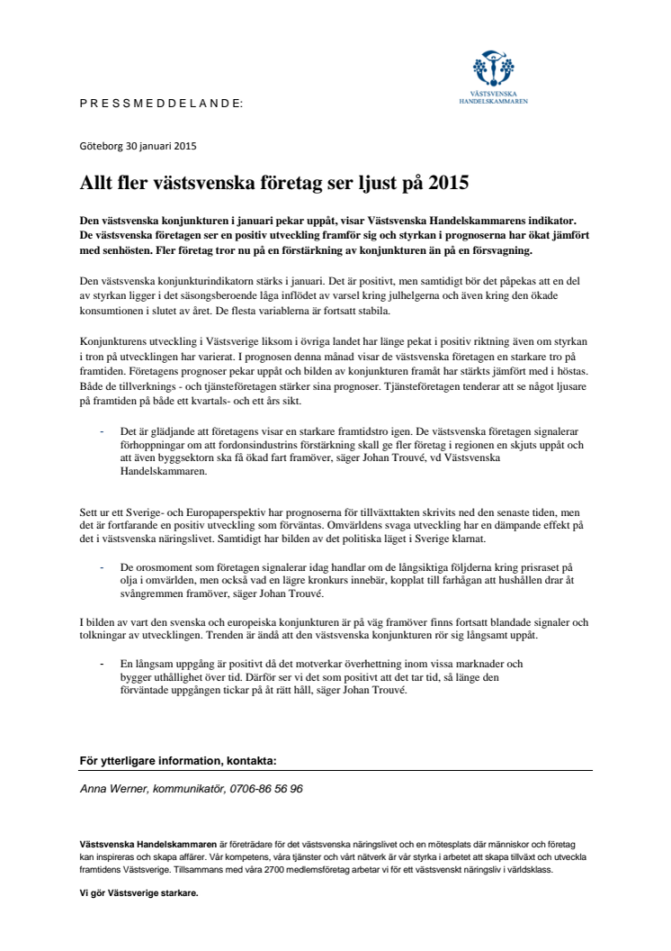Den västsvenska konjunkturen i januari pekar uppåt, visar Västsvenska Handelskammarens indikator. De västsvenska företagen ser en positiv utveckling framför sig och styrkan i prognoserna har ökat jämfört med senhösten. Fler företag tror nu på en förstärkning av konjunkturen än på en försvagning.