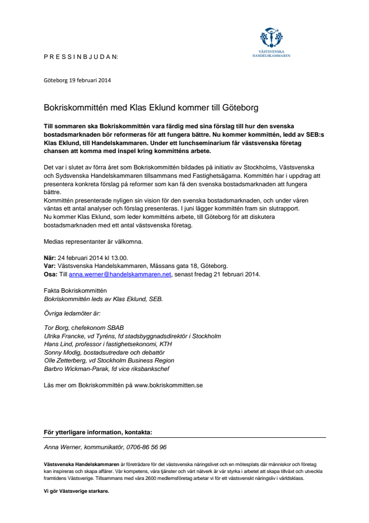 Till sommaren ska Bokriskommittén vara färdig med sina förslag till hur den svenska bostadsmarknaden bör reformeras för att fungera bättre. Nu kommer kommittén, ledd av SEB:s Klas Eklund, till Handelskammaren. Under ett lunchseminarium som arrangeras tillsammans med Fastighetsägarna får västsvenska företag chansen att komma med inspel kring kommitténs arbete.
