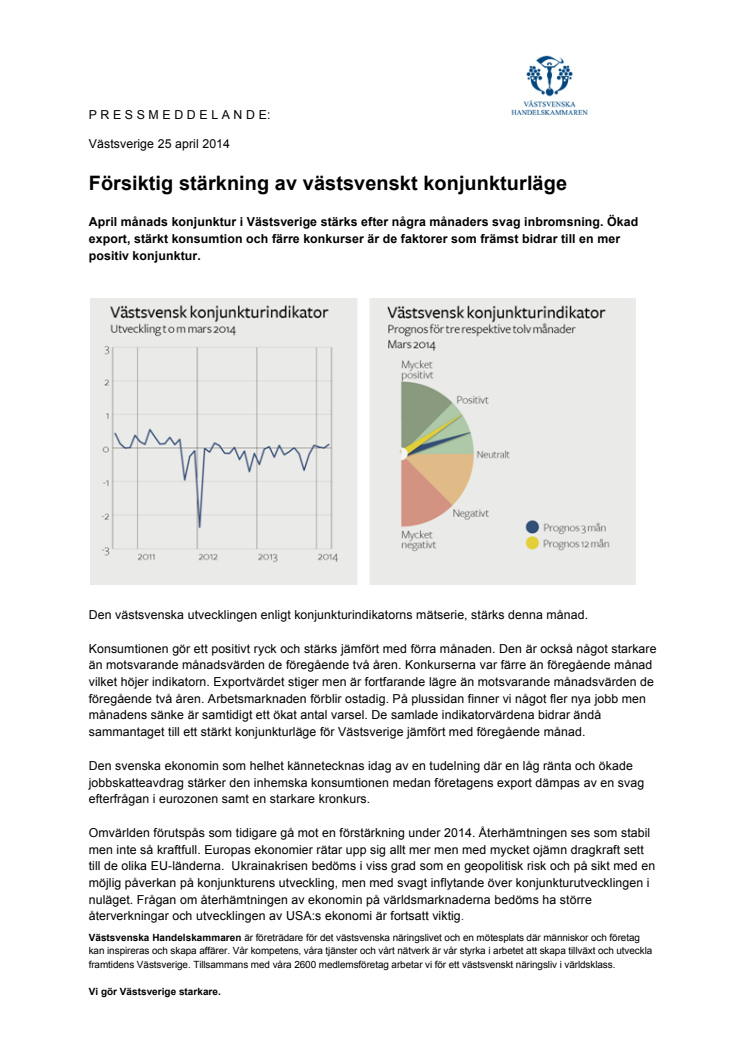 April månads konjunktur i Västsverige stärks efter några månaders svag inbromsning. Ökad export, stärkt konsumtion och färre konkurser är de faktorer som främst bidrar till en mer positiv konjunktur.