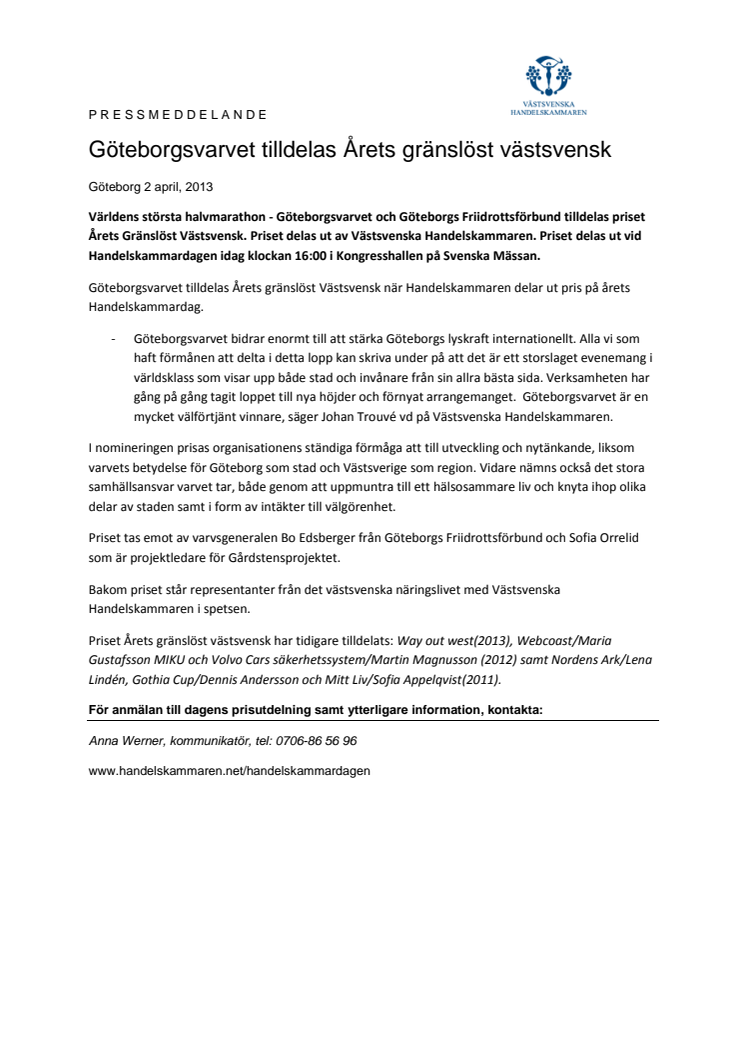 Världens största halvmarathon - GöteborgsVarvet och Göteborgs Friidrottsförbund tilldelas priset Årets Gränslöst Västsvensk. Priset delas ut av Västsvenska Handelskammaren. Priset delas ut vid Handelskammardagen idag klockan 16:00 i Kongresshallen på Svenska Mässan.