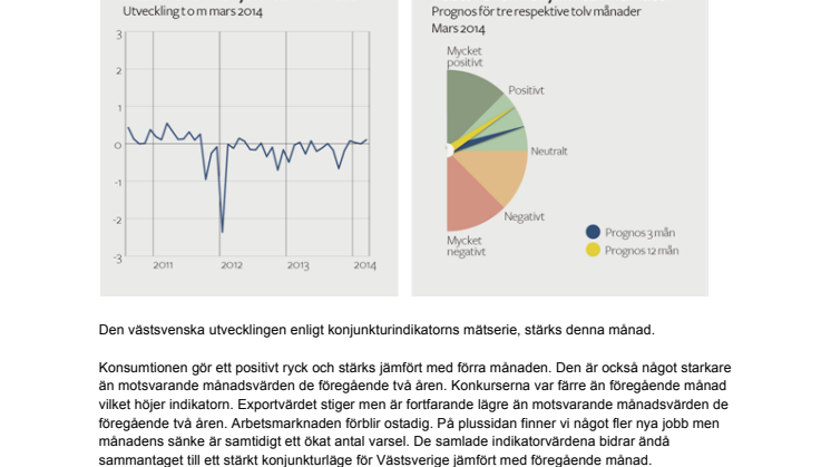 April månads konjunktur i Västsverige stärks efter några månaders svag inbromsning. Ökad export, stärkt konsumtion och färre konkurser är de faktorer som främst bidrar till en mer positiv konjunktur.