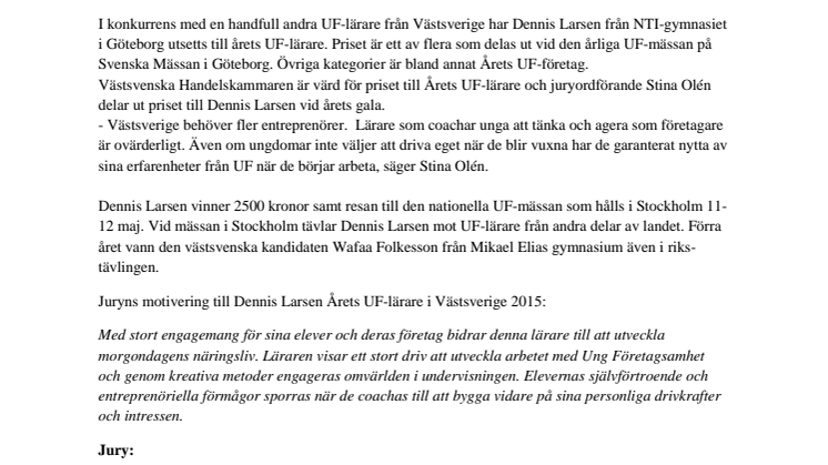 I konkurrens med en handfull andra UF-lärare från Västsverige har Dennis Larsen från NTI-gymnasiet i Göteborg utsetts till årets UF-lärare. Priset är ett av flera som delas ut vid den årliga UF-mässan på Svenska Mässan i Göteborg. Övriga kategorier är bland annat Årets UF-företag. Västsvenska Handelskammaren är värd för priset till Årets UF-lärare och juryordförande Stina Olén delar ut priset till Dennis Larsen vid årets gala.- Västsverige behöver fler entreprenörer.Lärare som coachar unga att tänka och agera som företagare är ovärderligt. Även om ungdomar inte väljer att driva eget när de blir vuxna har de garanterat nytta av sina erfarenheter från UF när de börjar arbeta, säger Stina Olén.