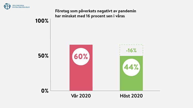 I maj uppgav 60 procent av företagen att de påverkades negativt av pandemin, den siffran har nu minskat till 44 procent. Lika många, 44 procent, hävdar att de inte påverkas alls.